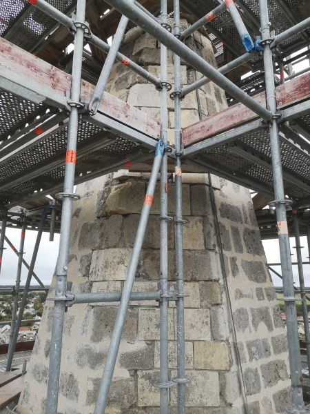 Le mardi 20 octobre 2020 - Mise en place des dernières rangées de pierres au sommet du clocher de l'église.